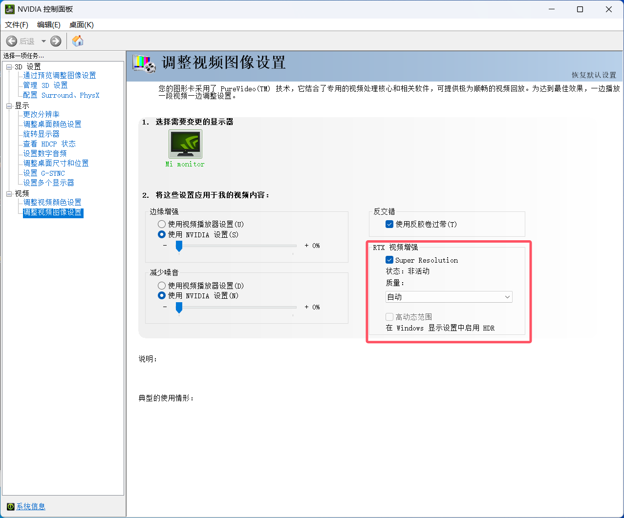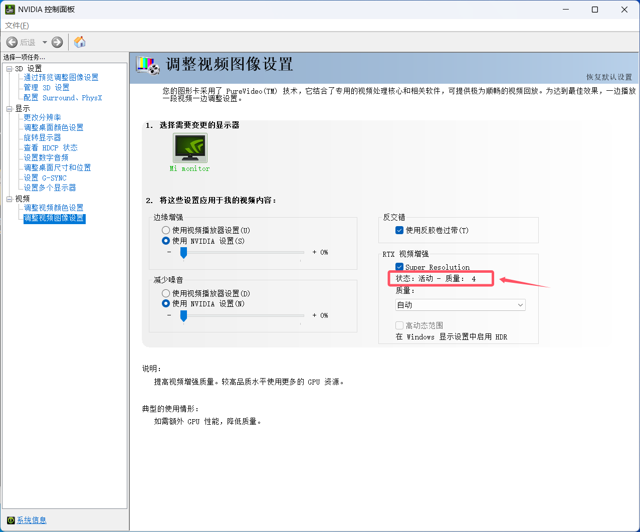 - 打开nvidia控制面板:视频->调整视频图像设置,勾上rtx视频增强,质量建议选择自动。如下图所示