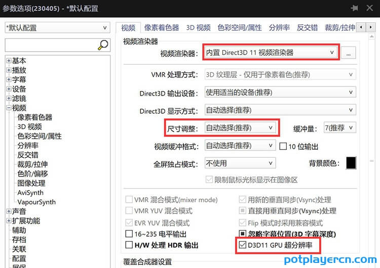 打开PotPlayer“选项 - 视频”,勾选“D3D11 GPU 超分辨率”,若无法勾选,先勾选视频缓冲格式后面的“10位输出”。。
