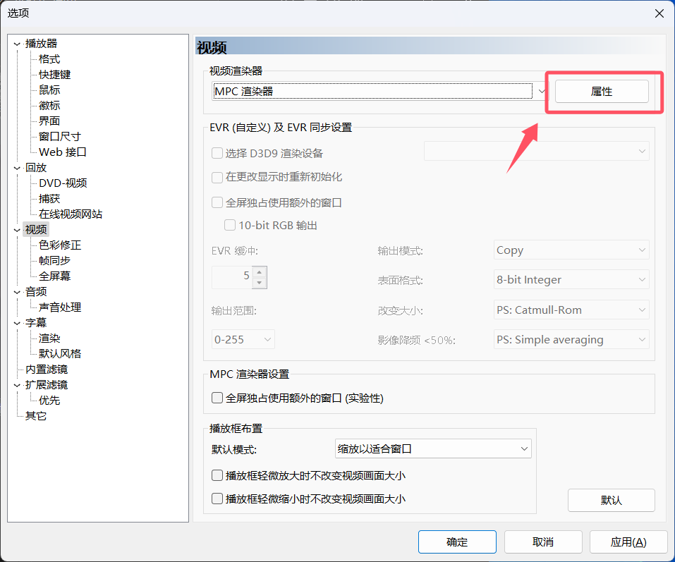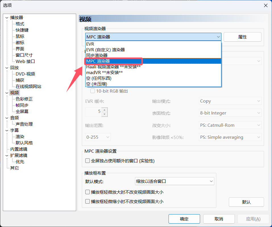 - 打开MPC-BE播放器,选项,切换到视频菜单栏,视频渲染器选择